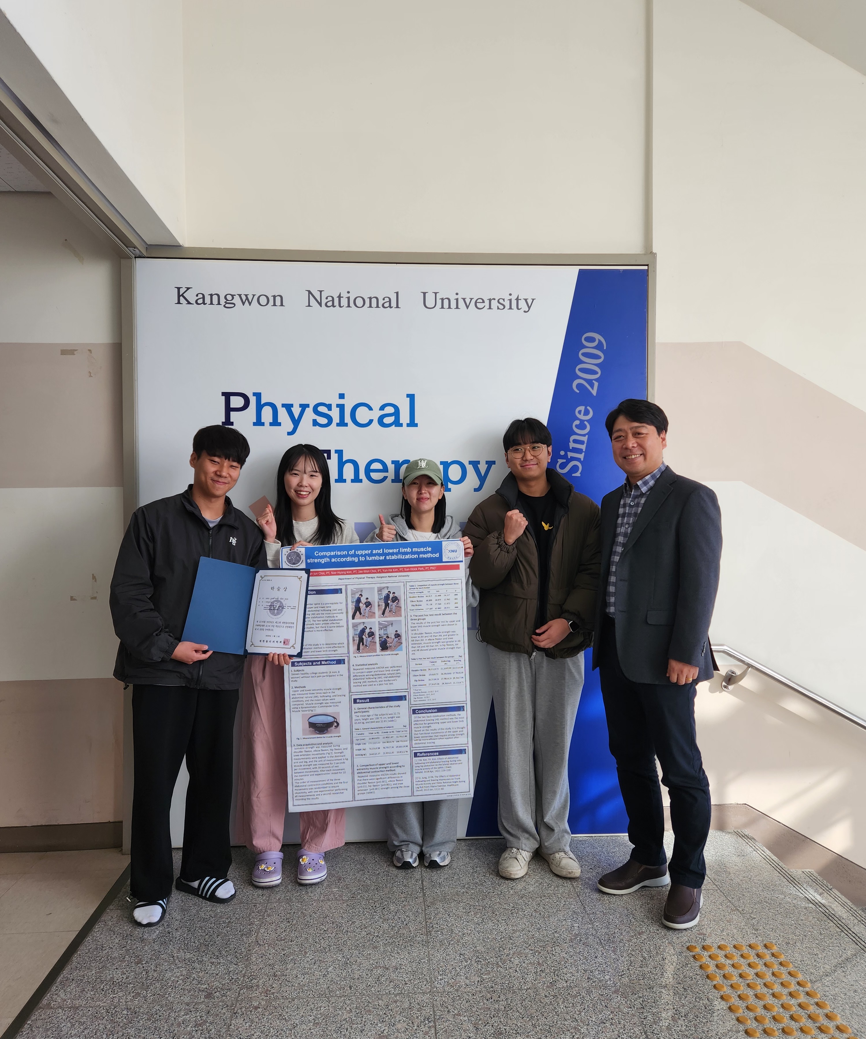 2023.11.11일 부산가톨릭대학에서 개최된 제 21회 대한물리의학회 추계학술대회에서 최현준, 김내향, 최재원, 김윤하 (지도교수 박선욱) 4학년 학생들이 Comparison of upper and lower limb muscle strength according to lumbar stabilization method 제목으로 포스터 부분 학술상을 수여받았습니다.